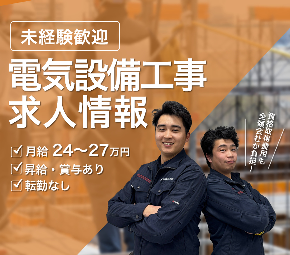| 必要資格・経験 | ●普通自動車免許(AT限定可) ※定年六十歳、嘱託六十五歳 《以下資格をお持ちの方は優遇!》 ●電気工事士 ↓ こんな方を、待っています ↓ ◎責任感があって誠実な方 ◎パワーのある方 ◎前向きで一生懸命な方 ◎新しいことを学ぶことに、楽しみ・喜びを感じられる方 ◎辛抱強く、負けず嫌いな一面をお持ちの方 ◎「〇〇年後はこういう生活をしたい」という目標をお持ちの方 |